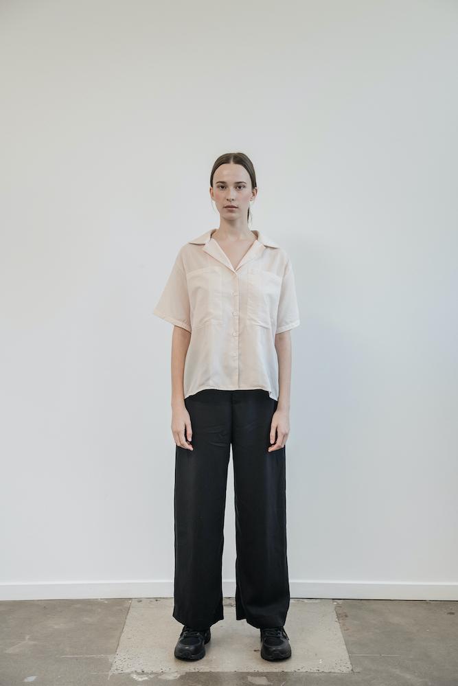 Get your very own, made to order RL16 Bowling Shirt in Japanese milled, GOTS Organic Cotton and Tencel. It's the softest of peach colours and beautiful for layering under or over. Here is't pictured with our Tencel Crinkle shirt and Tencel Flow Trousers (coming soon).